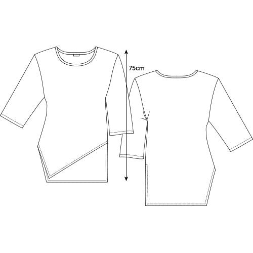 Dana is a comfortable loose shape that is cut on the bias to give a lovely drape that flows with the asymmetrical shaping of the front. It has a dropped shoulder line, and the sleeve finishes just below elbow. The back comes down longer for good bum coverage. Works well with many pants and skirt styles, worn on it's own or layered over a Obsidian top or long sleeved top in cooler weather.