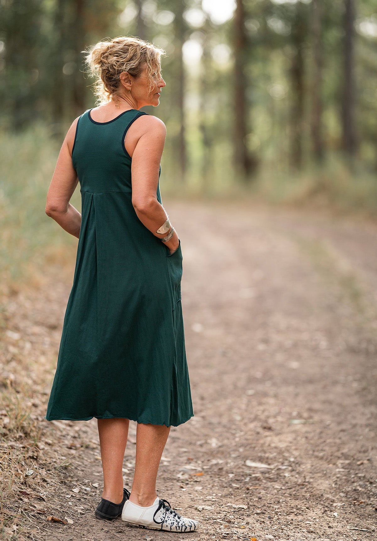 The Abby midi dress is a throw on and go style. It's got awesome large front pockets which are coverstitched on and the back yoke creates a vest-like look. The skirt part of this dress is A line and the back has an inverted pleat to add some more fullness. The hem has a raw edge so it can be shortened easily. The length from shoulder to hem is approx 120cm.
