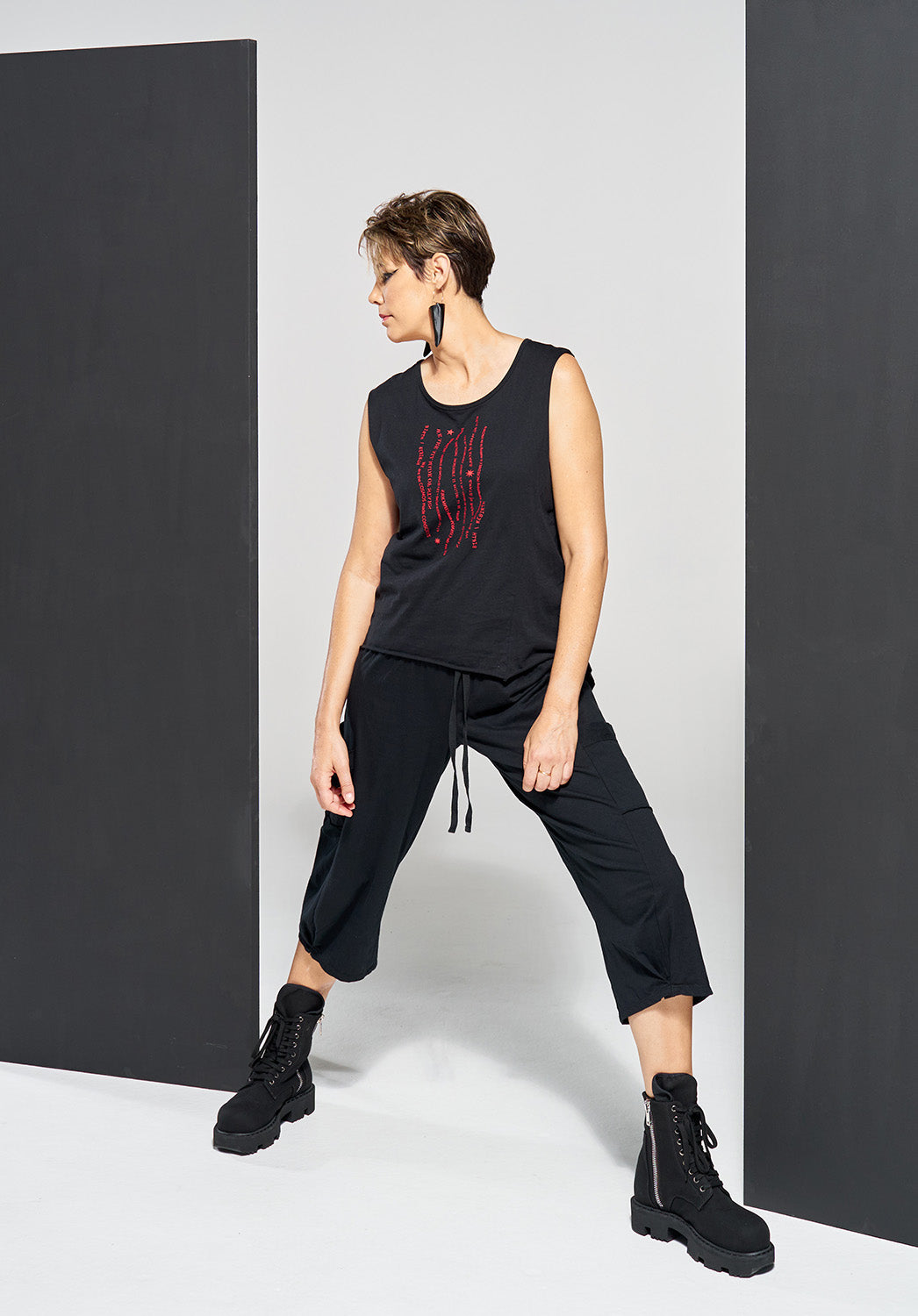 The short hair brunette model, Amanda is 180cm and wears a size S.
