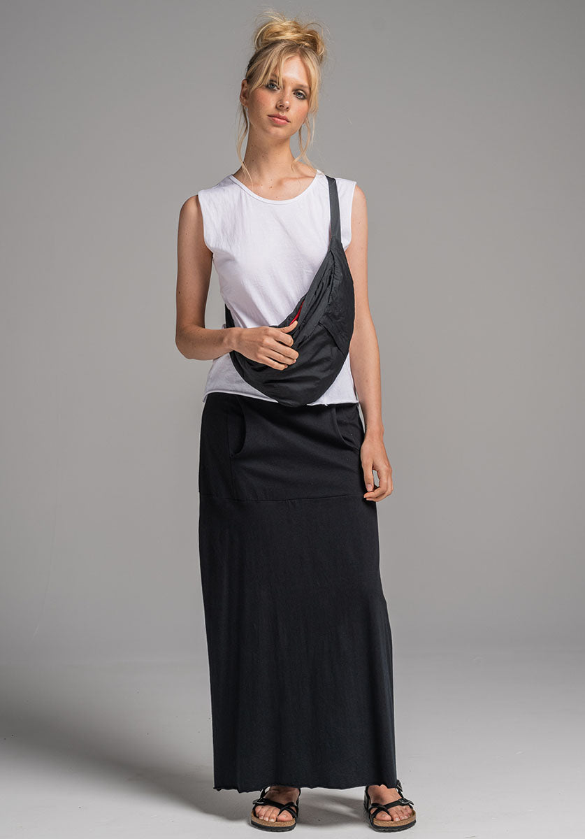 The Archie tank is a boxy unisex style. On the left hand side there is a small panel to add more room around the hips. The back scoops down to a raw shirt tail hem, which can be trimmed if you require it shorter. The neckline are bound but the armholes are raw to make it a light summer tank top. An easy casual throw on style, that doesn't cling anywhere.