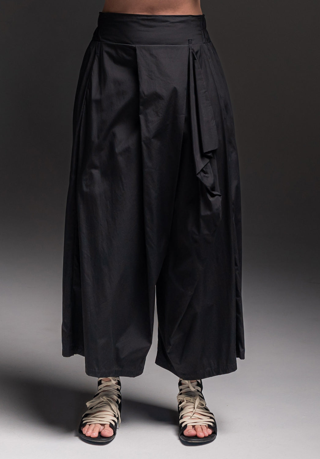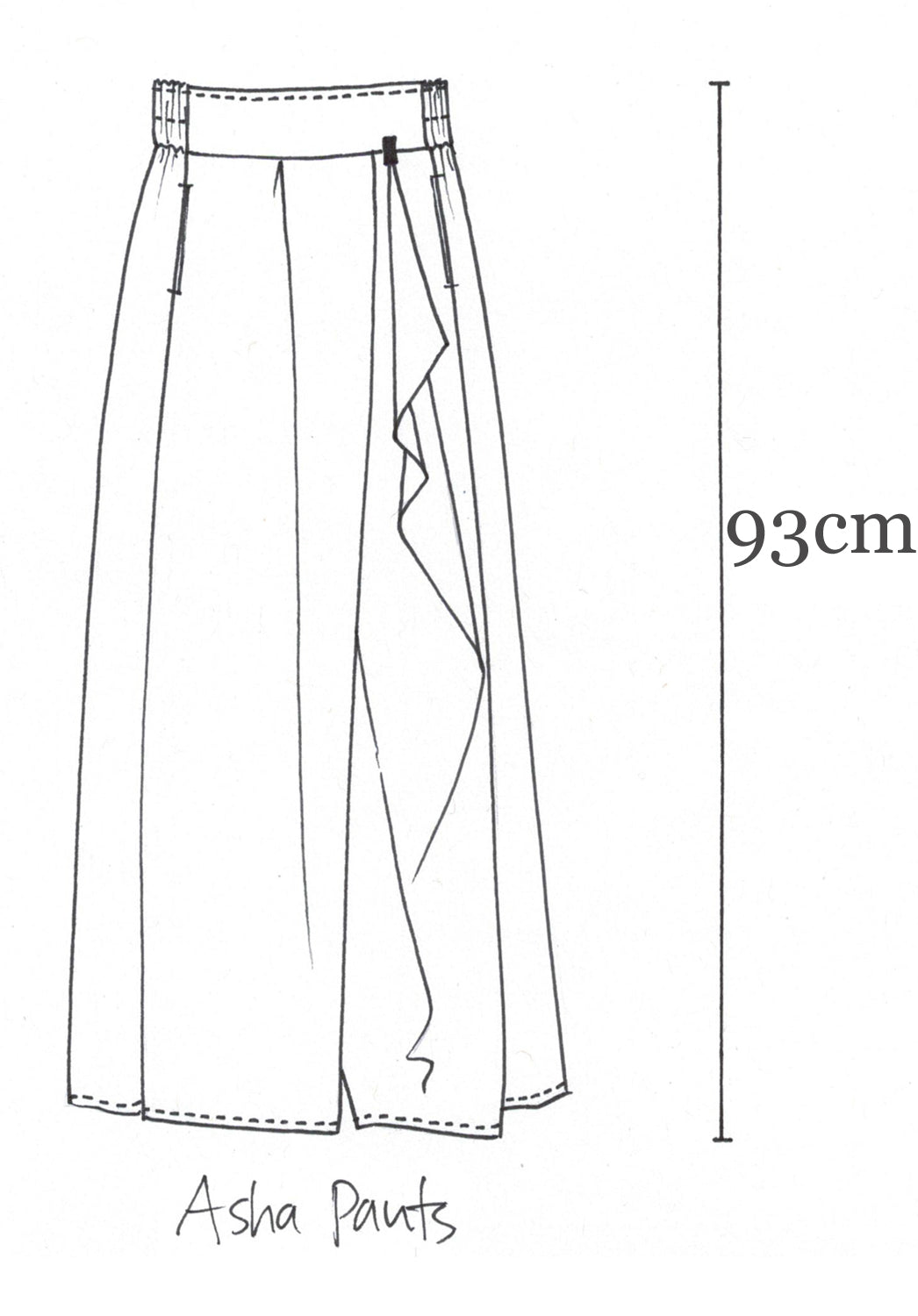 The Asha pants are a loose airy pant with an origami type pleating across the front. The waistband is flat at centre front and elasticated at the sides and back for comfort and ease of getting in and out of. They have two concealed pockets.