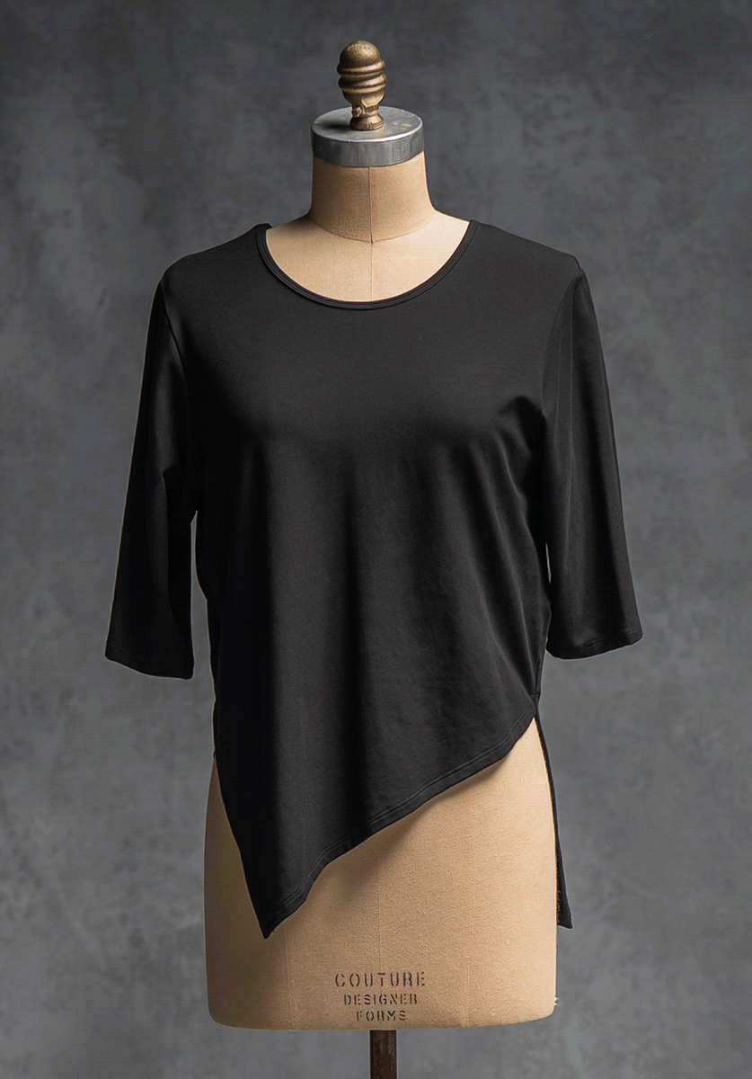 Dana is a comfortable loose shape that is cut on the bias to give a lovely drape that flows with the asymmetrical shaping of the front. It has a dropped shoulder line, and the sleeve finishes just below elbow. The back comes down longer for good bum coverage. Works well with many pants and skirt styles, worn on it's own or layered over a Obsidian top or long sleeved top in cooler weather.