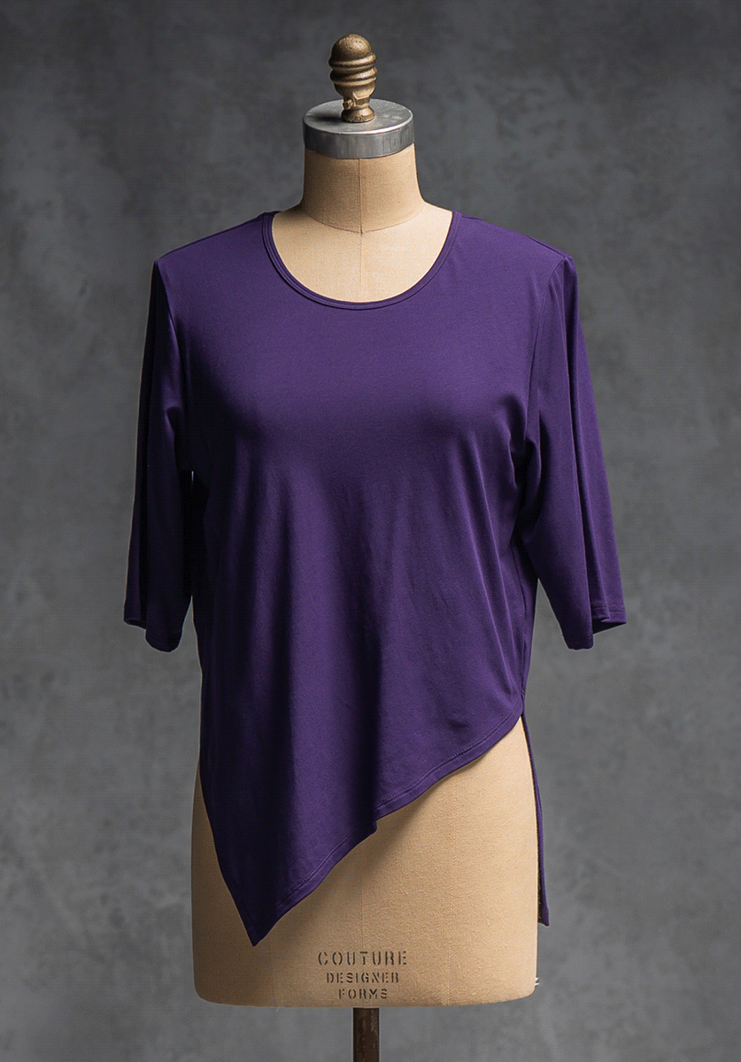 Dana is a comfortable loose shape that is cut on the bias to give a lovely drape that flows with the asymmetrical shaping of the front. It has a dropped shoulder line, and the sleeve finishes just below elbow. The back comes down longer for good bum coverage. Works well with many pants and skirt styles, worn on it's own or layered over a Obsidian top or long sleeved top in cooler weather.