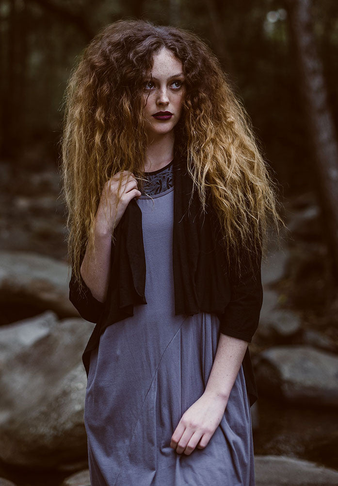 Just like the other Bestowed shrugs, this handy Ester cardi is a great layering piece! Perfect for travelling, providing just a little extra warmth and adding sleeves to an outfit. It has 3/4 sleeves and a shawl collar which can be scrunched up or down. It features a beautiful tail that cascades down at the back.