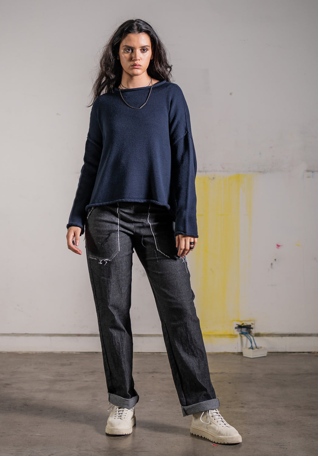 The new version is made from a soft medium weight black Japanese denim which is lots softer and lighter than the previous denims we have used. Also the pants have been slimmed down a little as we didn't need to prewash this fabric in a 60 degrees hot wash. Also we have used a slightly stretchier organic cotton fabric for the waistband, making these pants even more comfy.
