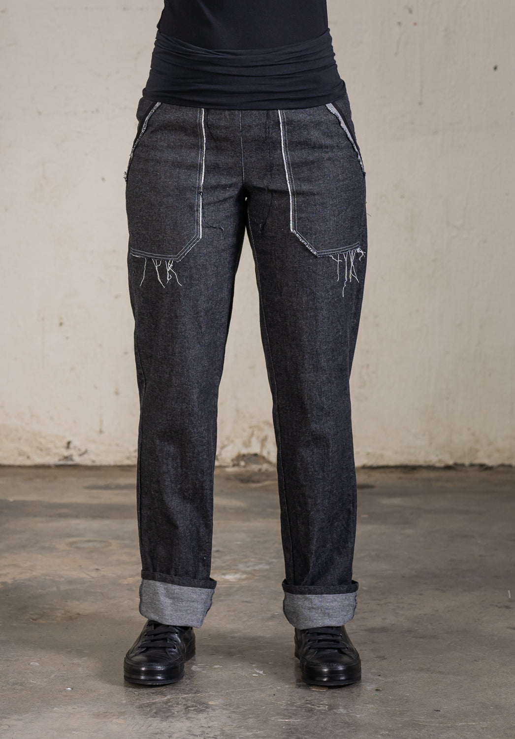 The pockets have been designed to make the most of the contrast between the face of the fabric and the lighter coloured reverse. The front pockets have tape on the opening edge. Both front and back pockets have been stitched with a contrast silver thread to add to the detail of these pants.