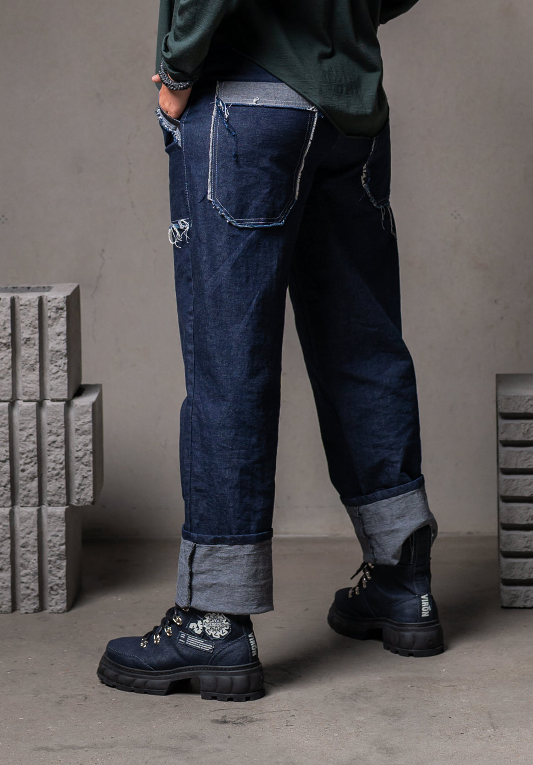 The pockets have been designed to make the most of the contrast between the face of the fabric and the lighter coloured reverse, with the front pockets having tape on the opening edge. Both front and back pockets have been stitched with a contrast white thread to add to the detail of these pants.