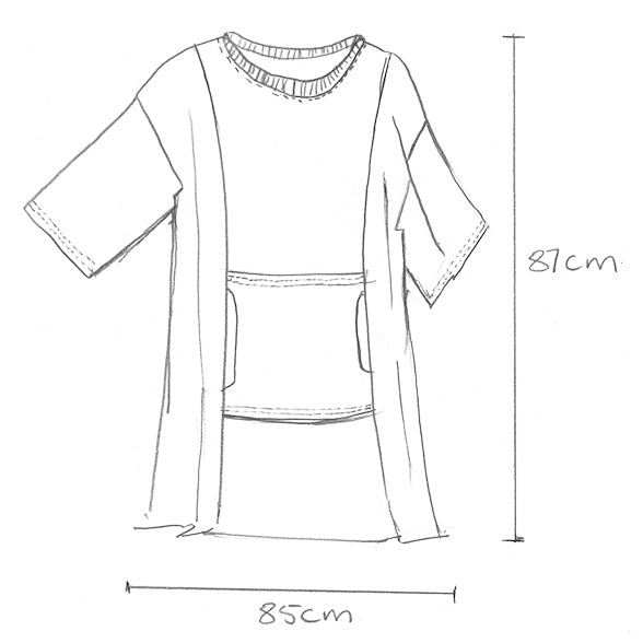 Made of a soft organic cotton, the Joey dress is an oversized tee-dress that you can just throw over leggings, pants or a skirt. It has loose sleeves that can be rolled up easily to shorten at will. This style features a 'joey' pocket at the centre front which is borrowed from the Blythe maxi! The neckline is a charcoal chunky rib fabric which matches the contrast charcoal stitching on the hems and pocket.The 2021 version of the Joey is a cute patched edition created using pieces of our Lino cut screen printed fabric patched with plains. The print pieces were cut when we were making the summer styles as there was wasted space in the marker that the panels and pocket fitted in perfectly and is part of our zero waste policy.