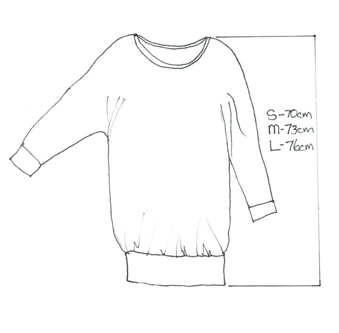 This top has an 80's feel, it is a loose easy wear and super flattering over the bust and tummy. It pulls into a band on the hips. This band can be adjusted up and down to where it suits you the most and the band can sit flat or be rouched. The sleeves are finished at a 7/8 length with a soft cuff. They can be easily pushed up your arms to shorten, which is comfortable and adds more fullness to the sleeve shape.