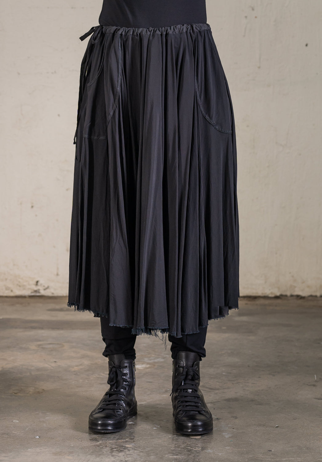 The Mist midi is a midi length full circle skirt with a drawcord in a casing waistband. You can get a perfect fit by tying the soft ribbon at the left side. There are two front pockets with cotton bound edges and the hem is single stitched with a raw edge for texture. This skirt has all of the fullness at the hem without excess bulk at the waist. The weight of the fabric gives the fade midi an amazing flow.