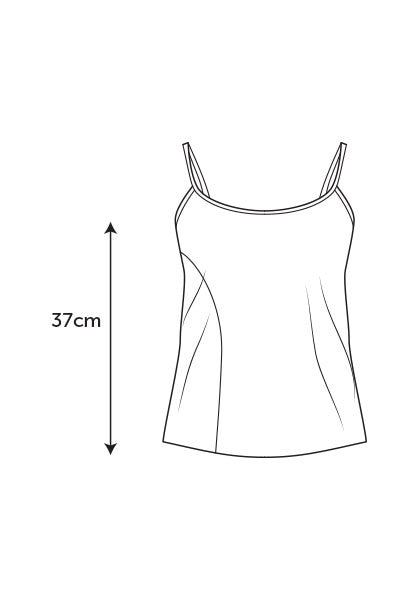 A soft and light singlet top with no side seams, but has a flattering twisted seam that comes from under the arm and across the body. Neckline and arms are bound in a black stretch cotton to hold their shape. Can be worn for all occasions, including as sleepwear paired with boxer shorts.