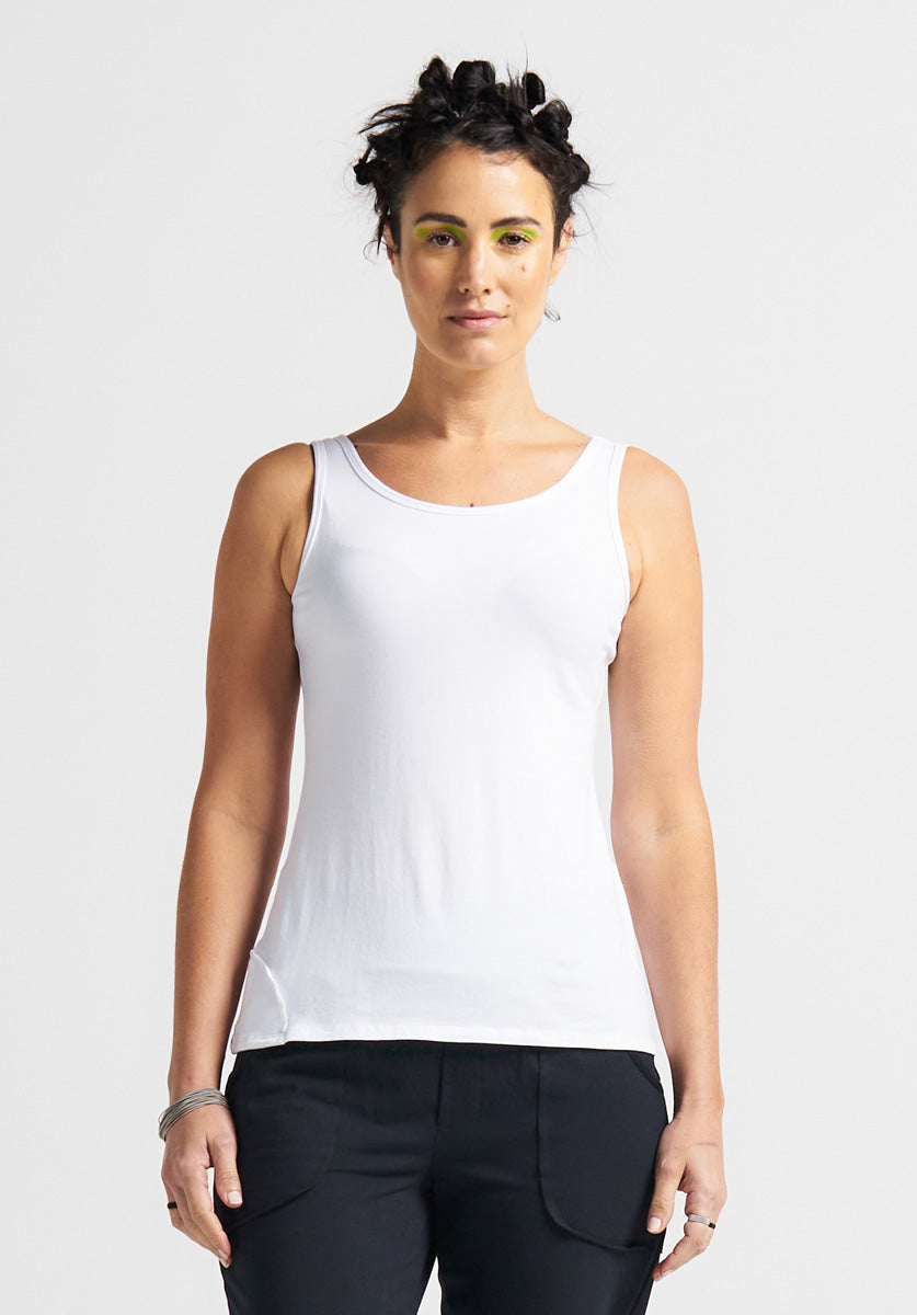 This singlet style has two neckline height options. One is higher and the other lower, so you have the option as to which way you want to wear the Origin singlet. To make it fully reversible I needed to remove the garment label from the neckline, so I devised a system of placing it low on the side seam, covering it with a curved patch detail on the outside. It is a fitted style with shaping at the waist and then more room over the hips. There is a decent amount of length to this style so can be worn lower on the hips or bunched up to be shorter.