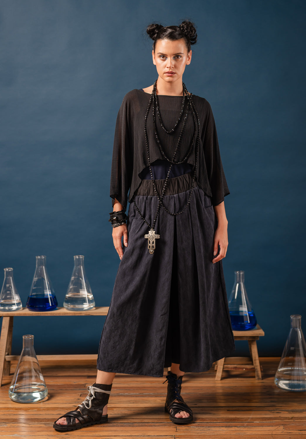 This top is made from the most divine Japanese crinkled Cupro fabric. It looks like a crinkle silk but unlike the light flyaway airy feel of silk, the crinkle Cupro is weighty with amazing drape, sitting close to the body. It’s a very dark midnight blue/black with a washer finish which highlights the crinkle texture.