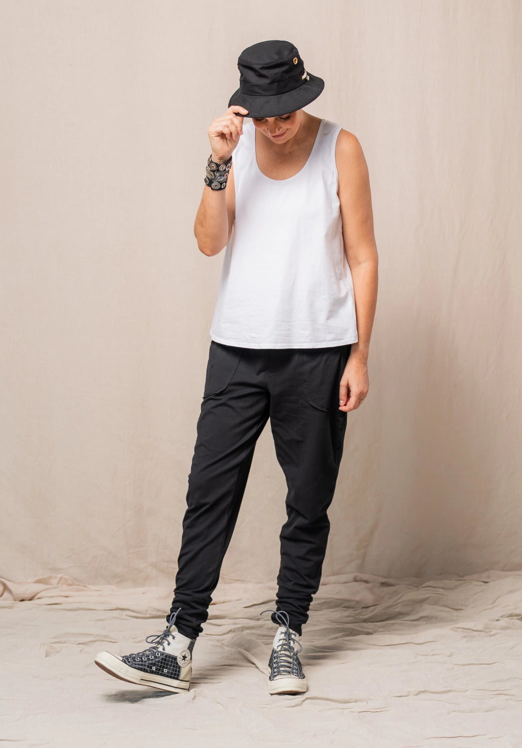 These pants come in two cuff lengths, the shorter length cuff will suit people around 167cm and under. Heather our 158cm model is wearing the short cuff version and the cuff is folded in half. Amanda is wearing the long cuff version, suited to taller people or people who want extra length in general.