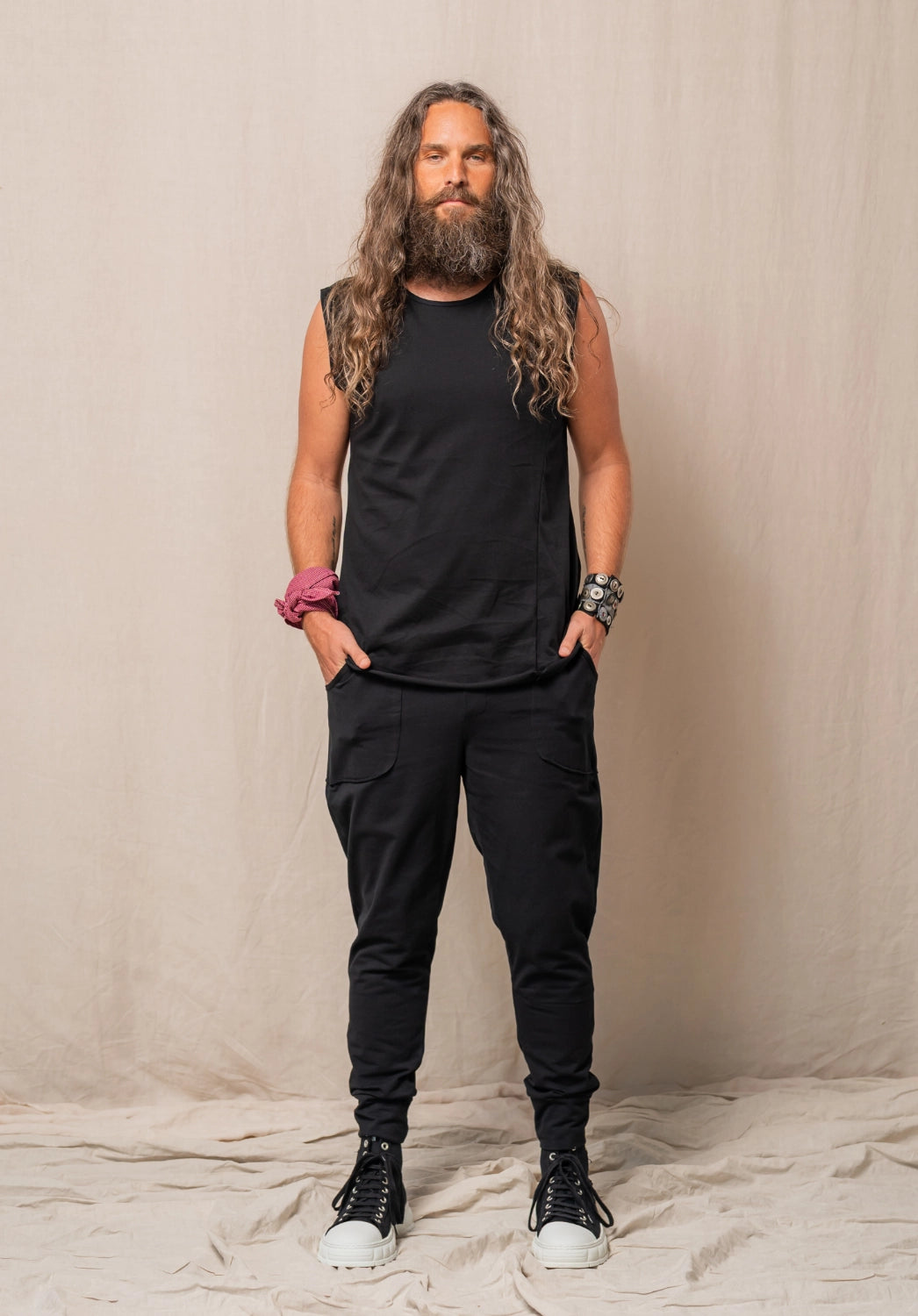 Davey our long curly hair model is 182cm tall and wears size L, short cuff.