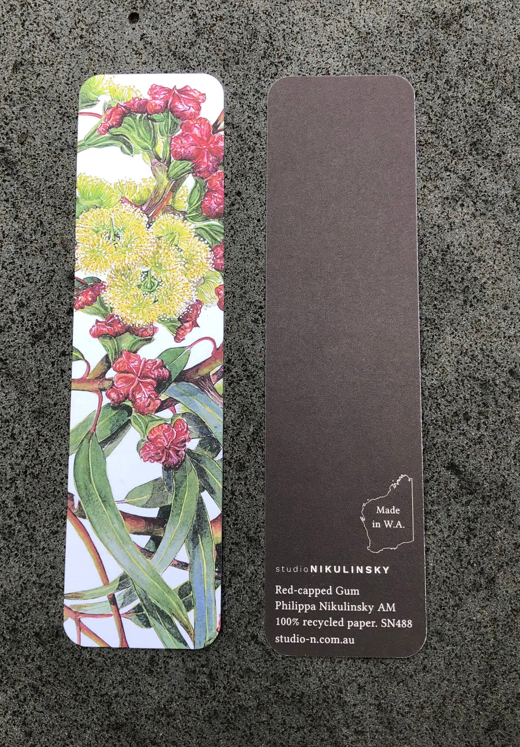 Featuring the watercolour painting of the Red-capped Gum, by Philippa Nikulinsky this Australian native flora bookmark is made in Western Australia.