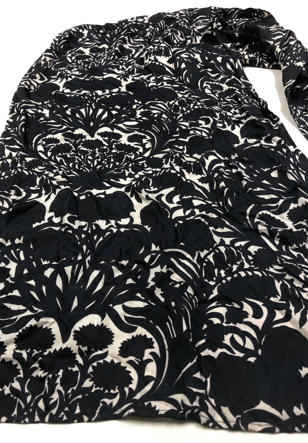 100% silk with black and taupe print. Fabric made in Italy. 85gsm weight.