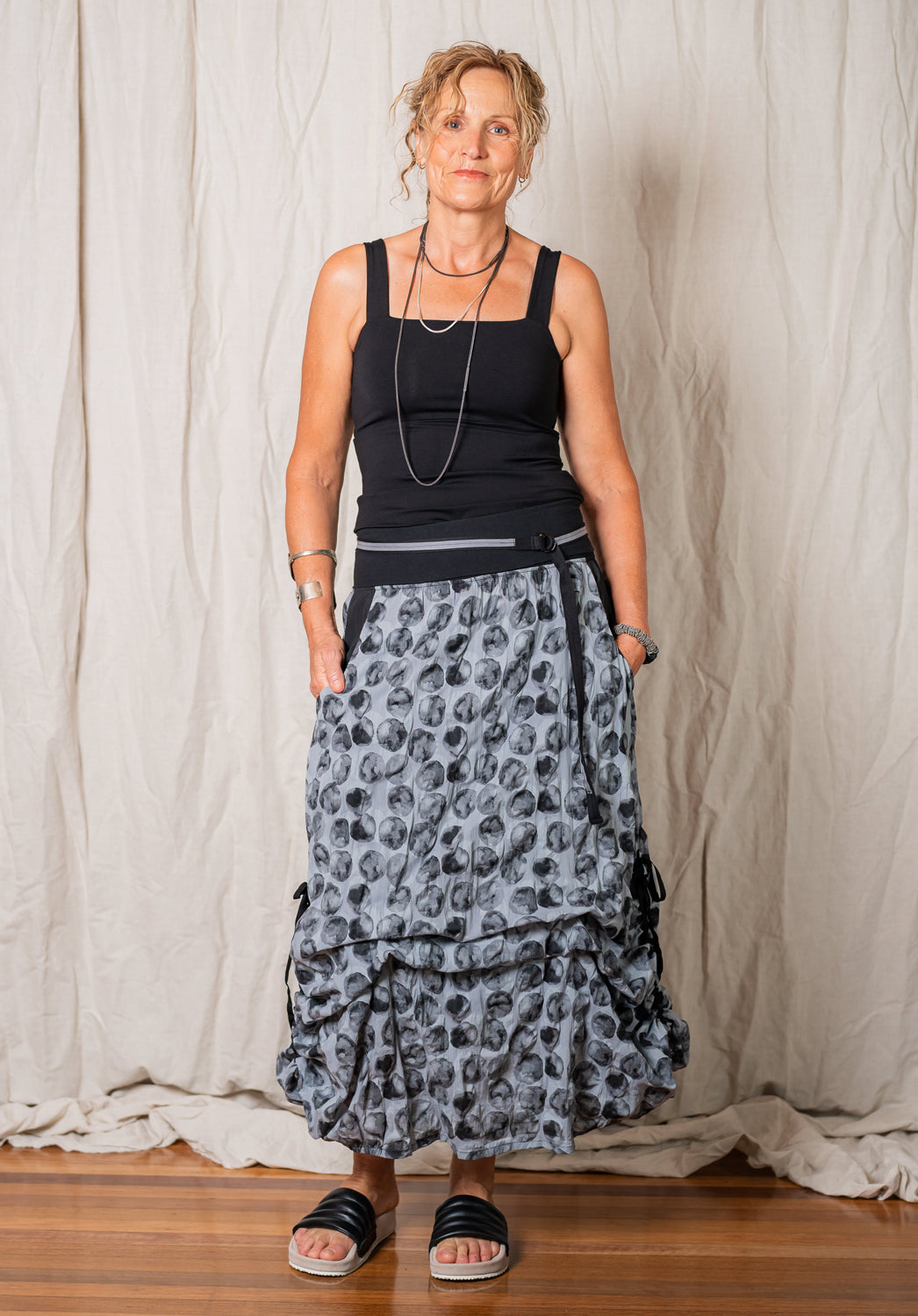The Trove skirt has a series of adjustable ties inside front and back. They can be tied together to create soft draped details and there are also side seam ribbons in a casing to rouch up and add to the customised look. These adjustments can shorten or lengthen the skirt so it's suitable for people of all heights.