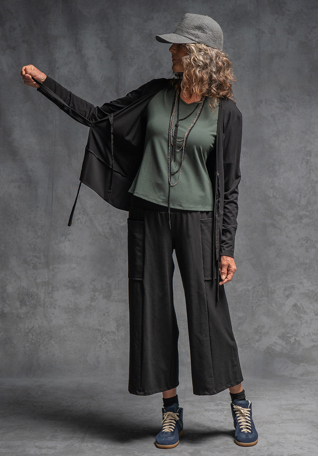 This soft V-neckline and slight flared shape over the hips makes for a flattering fit. The Viola has a centre back seam so fits perfectly into the small of your back. The sleeve is a generous short sleeve length and it has become one of our most popular styles, especially to wear loose over the top of pants or skirts because it is fitted around the waist then the flare means it doesn't cling to waistbands.